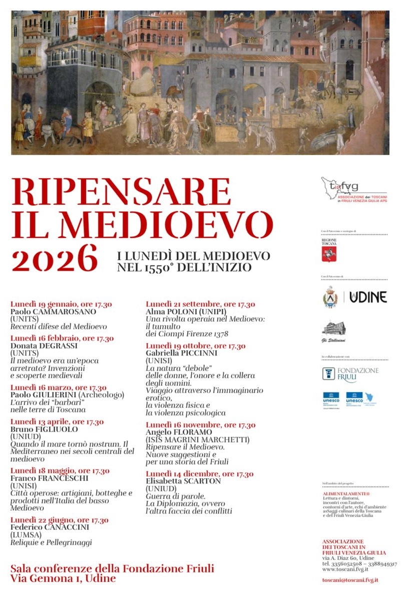 Lunedì 19 gennaio 2026, alle ore 17.30, nell’ambito de “I lunedì del Medioevo”, presso la Sala conferenze della Fondazione Friuli sita a Udine in Via Gemona, si terrà la prima “lezione” del ciclo organizzato dall’Associazione dei Toscani in Friuli Venezia Giulia allo scopo di “Ripensare il Medioevo”.